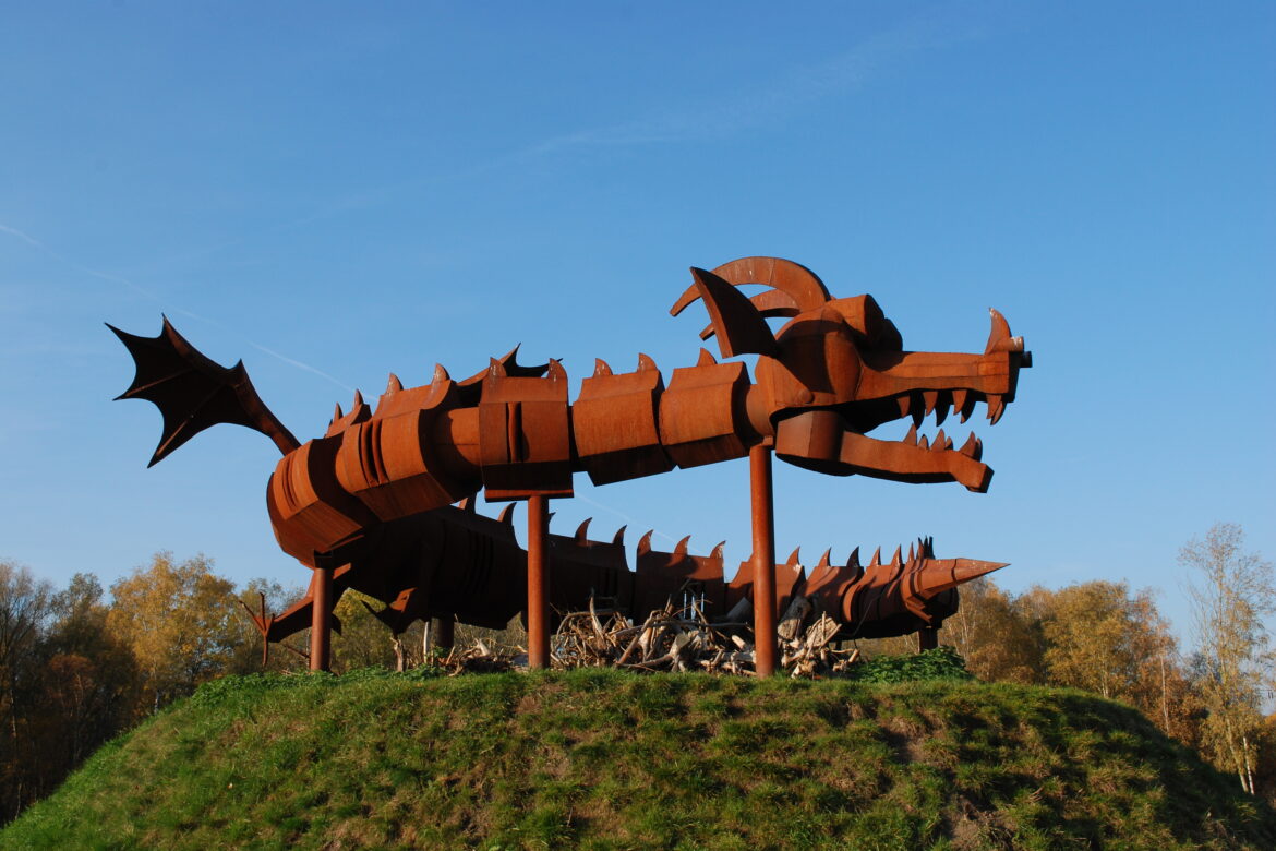 Seit vielen Jahren bewacht der Zauberdrache den ringsum mit 30.000 weiß und rosa blühenden Rosen bepflanzten Rosenberg in unserem Familiengarten. Da der Drache auf einem bewachsenen Berg liegt, kann er nur aus der Ferne betrachtet werden (das Betreten des Zauberberges ist verboten).